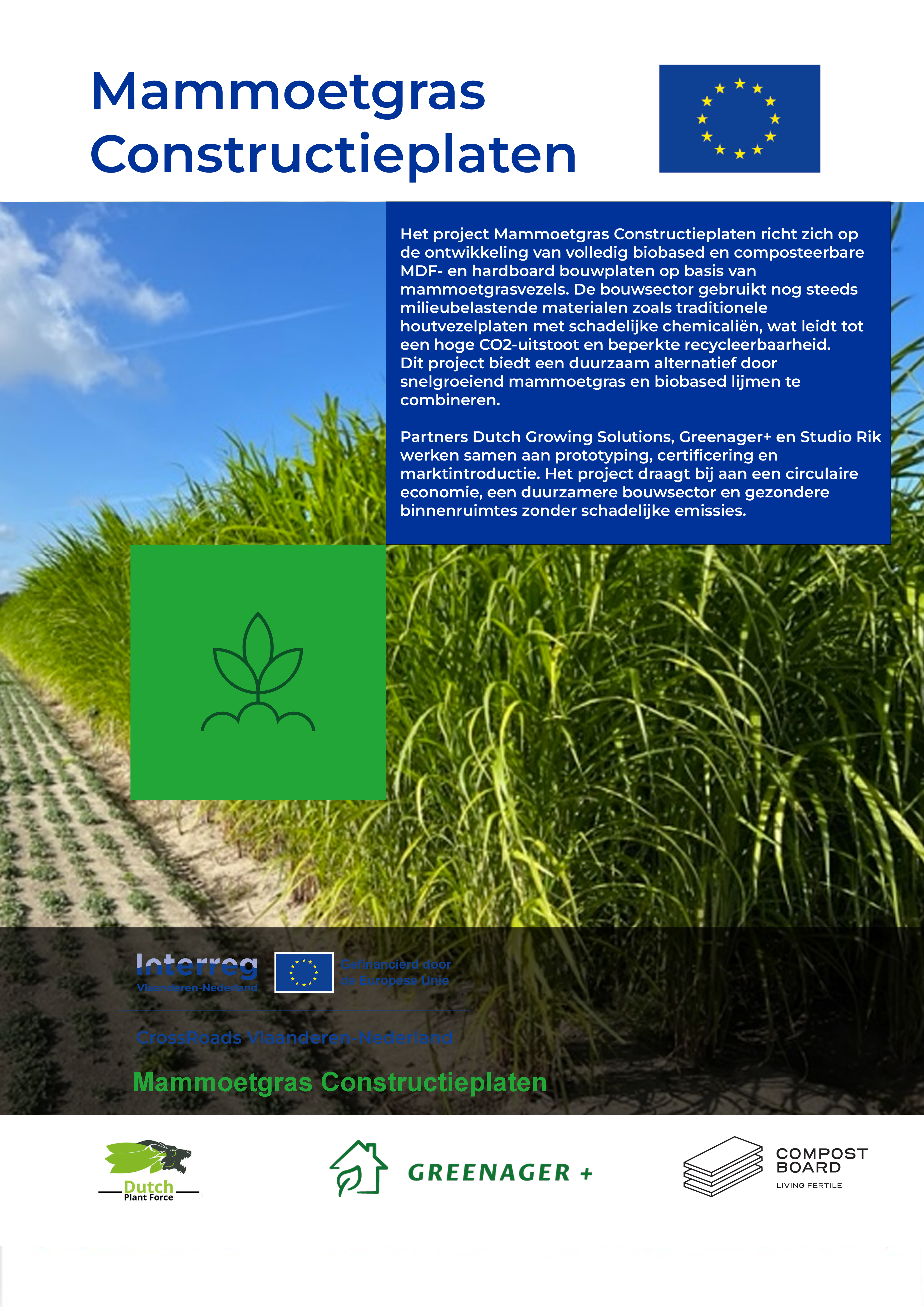 Het project Mammoetgras Constructieplaten richt zich op de ontwikkeling van volledig biobased en composteerbare MDF- en hardboard bouwplaten op basis van Mammoetgrasvezels. De bouwsector gebruikt nog steeds milieubelastende materialen zoals traditionele houtvezelplaten met schadelijke chemicaliën, wat leidt tot een hoge CO2-uitstoot en beperkte recycleerbaarheid. Dit project biedt een duurzaam alternatief door snelgroeiend mammoetgras en biobased lijmen te combineren.